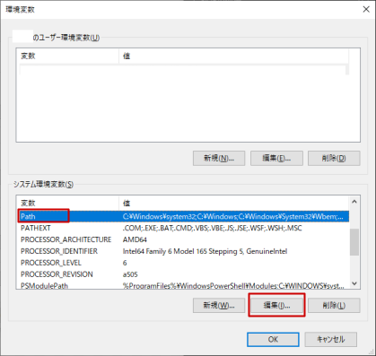 7.変数欄の「Path」を選択した状態で「編集」をクリックします。